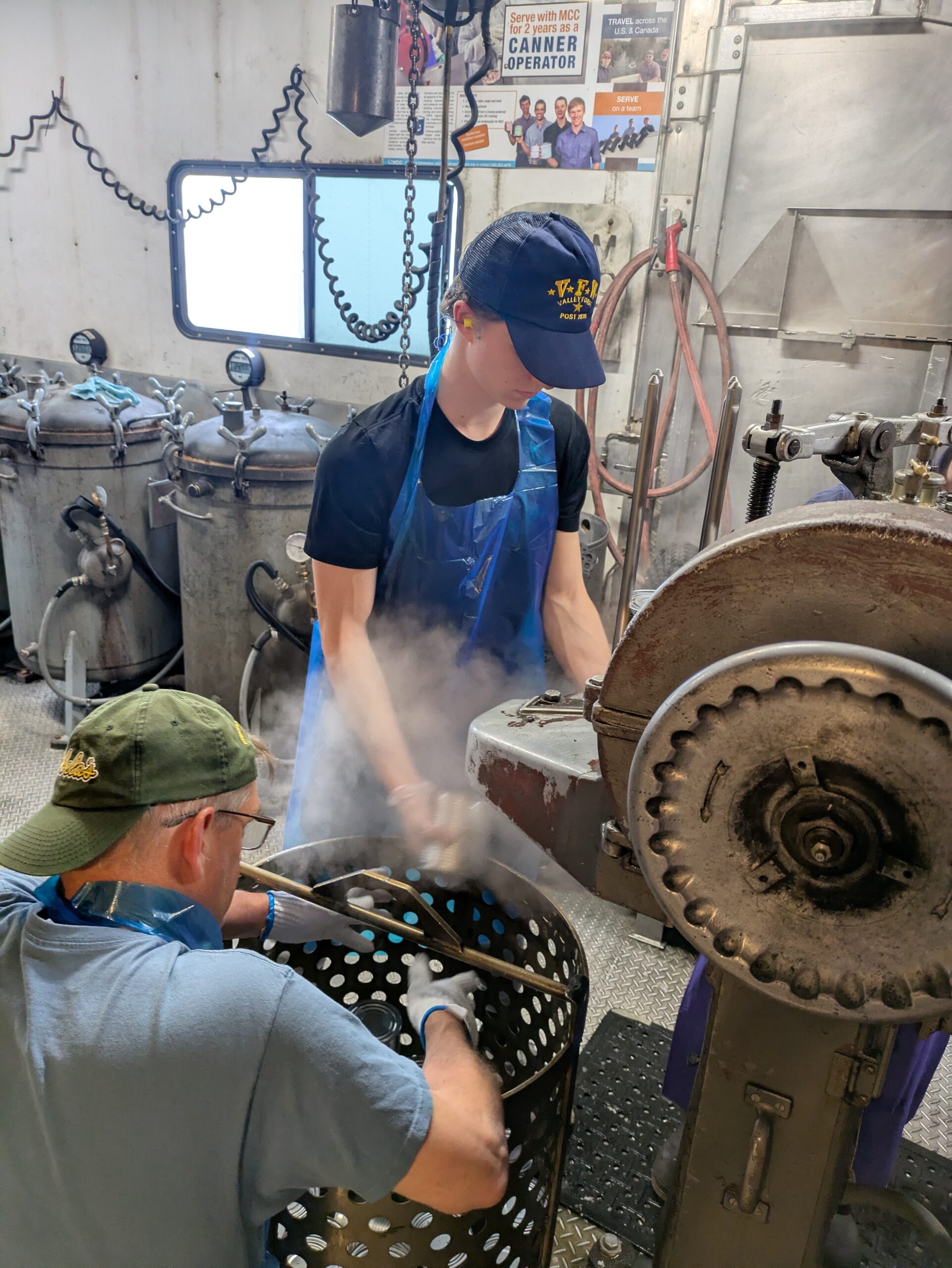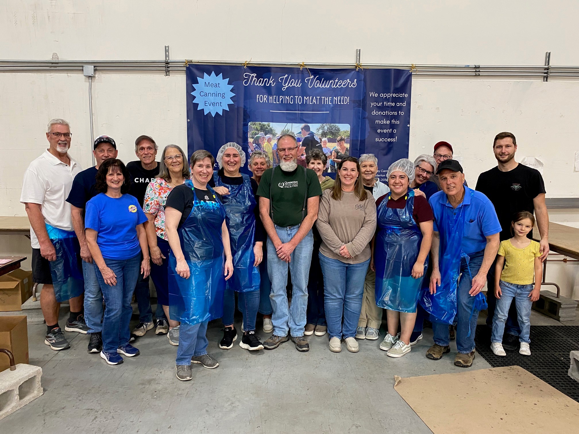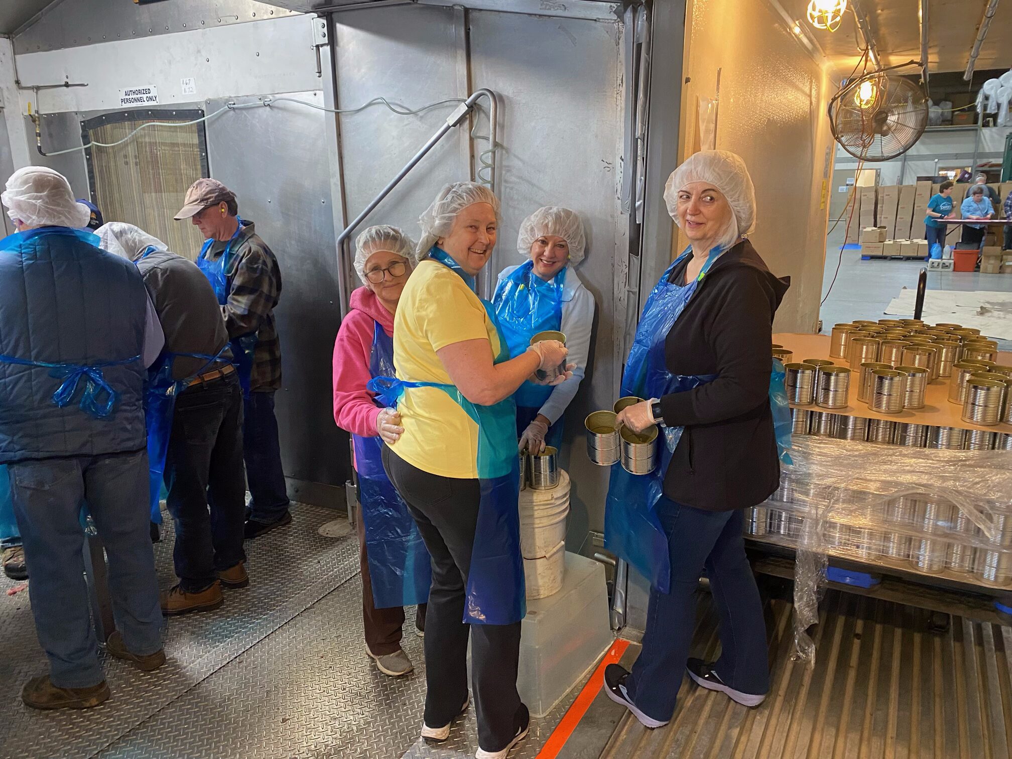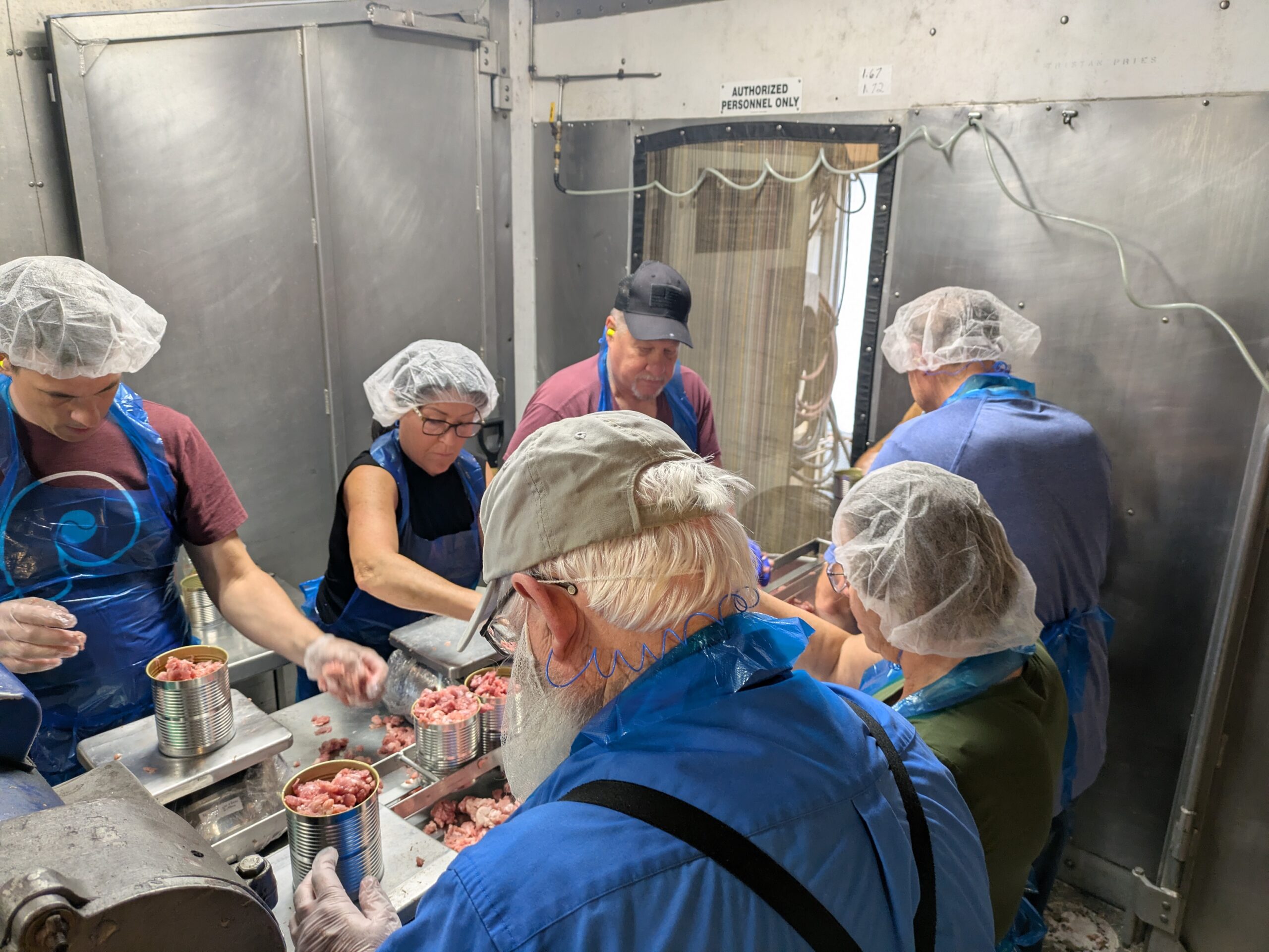 Refugees and others receive canned meat that is provided by our meat-canning process.